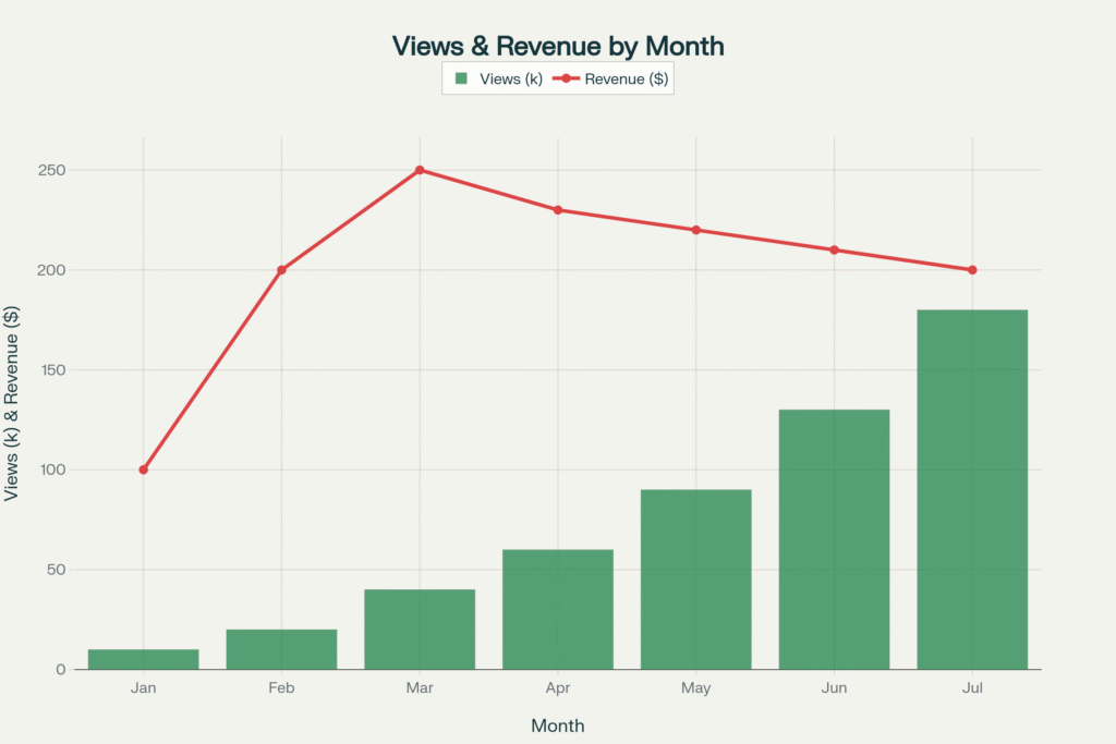 To visualize the issue, consider how ad revenue is tracked. A hypothetical chart (above) might show a steep climb in views (green bars) with an inexplicably flat or declining revenue line (red) – the “wedge” of income disappearing. Analysts note that typical revenue per view (RPM) should roughly correlate with view counts and ad rates, but in affected months many channels saw those metrics decouple.